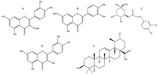 Chemical structures of compounds identified in the yellow bedstraw extracts: (A)—isoquercetin; (B)—cynaroside; (C)—chlorogenic acid; (D)—quercetin; and (E)—ursolic acid.