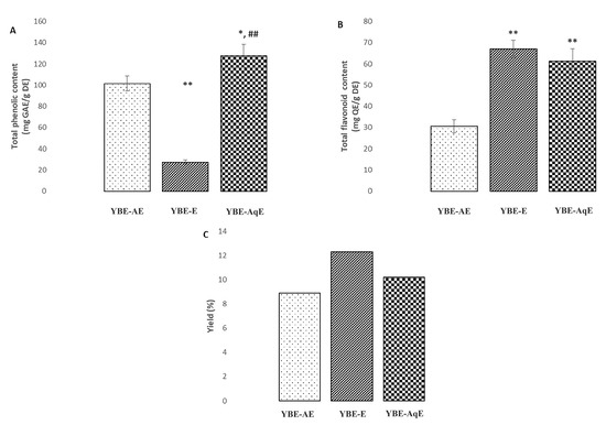 (A)—total phenolic content (TPC); (B)—total flavonoid content (TFC); and (C)—yield of different yellow bedstraw extracts. Values are means of three biological replicates ± SD. GAE—gallic acid equivalent; QE—quercetin equivalent; DE—dry extract; YBE-AE—yellow bedstraw acetone extract; YBE-E—yellow bedstraw ethanol extract; YBE-AqE—yellow bedstraw aqueous extract; *, statistical significance at the level of p < 0.05 in relation to YBE-AE group; **, statistical significance at the level of p < 0.01 in relation to YBE-AE group; and ##, statistical significance at the level of p < 0.01 in relation to YBE-E group. Data were analyzed using one-way ANOVA test.