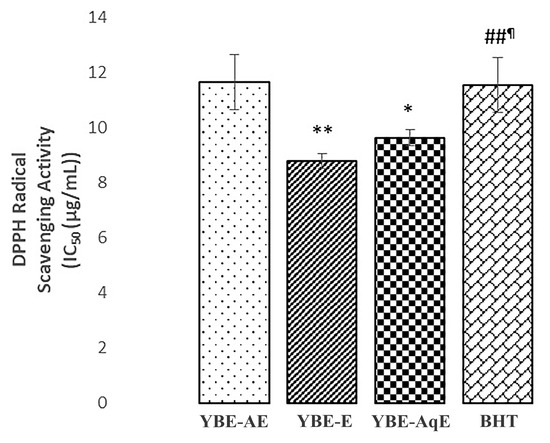 DPPH radical scavenging activity (IC50 (µg/mL). YBE-AE—yellow bedstraw acetone extract; YBE-E—yellow bedstraw ethanol extract; YBE-AqE—yellow bedstraw aqueous extract; and BHT—butylated hydroxytoluene. Values are means of three biological replicates ± SD; *, statistical significance at the level of p < 0.05 in relation to YBE-AE group; **, statistical significance at the level of p < 0.01 in relation to YBE-E group; ##, statistical significance at the level of p < 0.01 in relation to YBE-E group; and ¶, statistical significance at the level of p < 0.05 in relation to YBE-AqE group. Data were analyzed using a one-way ANOVA test.
