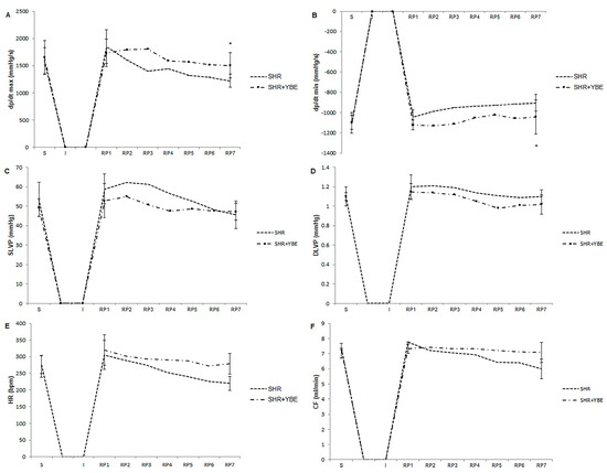 Effects of treatment with oral formulation loaded with YBE on ex vivo cardiac function in spontaneously hypertensive rats. (A)—dp/dtmax; (B)—dp/dtmin; (C)—SLVP; (D)—DLVP; (E)—HR; and (F)—CF. Data are presented as mean values ± standard deviation (X ± SD). *, statistical significance p < 0.05 between SHR and SHR + YBE; S—stabilization; I—ischemia; R1—first minute of reperfusion; R7—last, 30th minute of reperfusion; SHR—spontaneously hypertensive rats; YBE—yellow bedstraw extract; and n = 10 per group. Data were analyzed using a one-way analysis of variance (ANOVA).