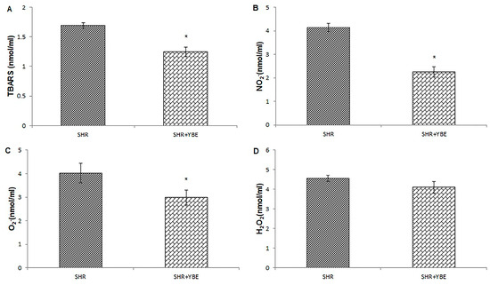 Effects of treatment with oral formulation loaded with YBE on the levels of prooxidant markers determined in blood samples of spontaneously hypertensive rats. (A)—TBARS; (B)—NO2−; (C)—O2−; and (D)—H2O2. Data are presented as mean values ± standard deviation (X ± SD); *, statistical significance p < 0.05 between SHR and SHR + YBE; and n = 10 per group. Data were analyzed using an independent samples t-test.