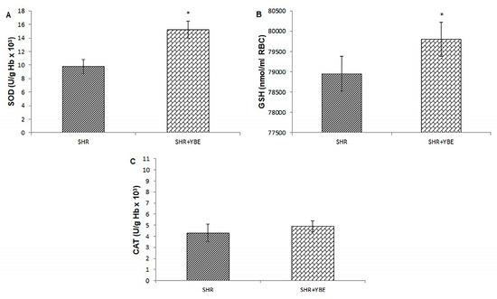 Effects of treatment with oral formulation loaded with YBE on the levels of antioxidant defense system markers determined in blood samples of spontaneously hypertensive rats; (A)—SOD; (B)—GSH−; (C)—CAT Data are presented as mean values ± standard deviation (X ± SD); *—statistical significance p < 0.05 between SHR and SHR + YBE; n = 10; Data were analyzed using an Independent Samples t-test.