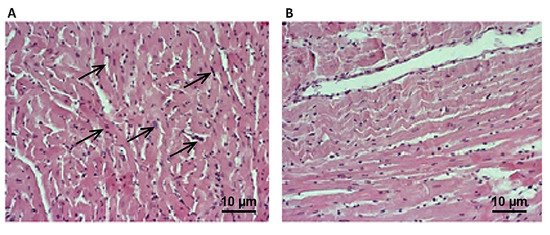 Effects of YBE oral liquid formulation on myocardium morphology—histopathological changes (magnification ×400). (A)—SHR group and (B)—SHR + YBE group. The black arrows indicate degenerative changes in myocardium of spontaneously hypertensive rats.