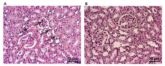 Effects of YBE oral liquid formulation on kidney morphology–histopathological changes (magnification ×400). (A)—SHR group and (B)—SHR + YBE group. The black arrows indicate degenerative changes in kidney of spontaneously hypertensive rats.