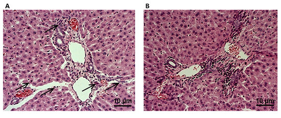 Effects of YBE oral liquid formulation on liver morphology–histopathological changes (magnification ×400). (A)—SHR group and (B)—SHR + YBE group. The black arrows indicate degenerative changes in liver of spontaneously hypertensive rats.