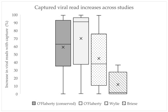 Box plot of increase in viral read capture in probe-based enrichment studies targeting viruses. “X” represents the mean. Values were calculated by calculating the percentage increase in viral reads in captured libraries compared to viral reads in uncaptured HTS libraries. For Wylie, this was calculated using the percentage of reference bases covered with captured and uncaptured HTS libraries [32,42,43]. Additional information can be found in supplementary information Table S1: Viral read Sup.