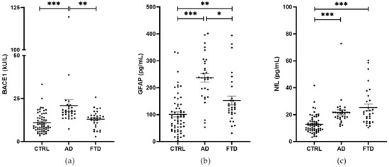 We compared serum BACE1 activity in FTD and AD patients. To this aim, we included in the analysis serum BACE1 activity data previously obtained by our group in 31 AD patients and 30 CTRL [13]. A significant increase in BACE1 activity was shown in AD patients compared to CTRL and FTD patients (mean ± SEM; AD, 20.88 ± 3.41 kU/L vs. CTRL, 10.97 ± 0.73 kU/L, Generalized Linear Model, padj < 0.001; AD vs. FTD, 12.96 ± 0.92 kU/L, Generalized Linear Model, padj = 0.007). No differences were observed between FTD and CTRL (padj = 0.12) (Figure 2a). All comparisons were adjusted for age and gender. Age was significantly and negatively associated with BACE1. Then, we evaluated GFAP and NfL levels. We observed a significant increase in GFAP levels in both AD and FTD patients compared to CTRL (mean ± SEM; AD, 236.70 ± 15.81 pg/mL vs. CTRL, 100.90 ± 9.42 pg/mL, Generalized Linear Model, padj < 0.001; FTD, 152.60 ± 16.32 pg/mL vs. CTRL, Generalized Linear Model, padj = 0.002) and in AD compared to FTD patients (AD vs. FTD, Generalized Linear Model, padj = 0.012) (Figure 2b). Moreover, we observed a significant increase in NfL levels in AD and FTD patients compared to CTRL (mean ± SEM; AD, 21.70 ± 1.88 pg/mL vs. CTRL, 12.83 ± 0.87 pg/mL, Generalized Linear Model, padj < 0.001; FTD, 25.28 ± 2.54 pg/mL vs. CTRL, Generalized Linear Model, padj < 0.001). No differences were observed between FTD and AD patients (p > 0.05) (Figure 2c). All comparisons were adjusted with Bonferroni post hoc correction and for age and gender as confounders. Age was significantly and positively associated with both GFAP and NfL levels. Gender was associated with GFAP, with males having lower levels of GFAP than females.