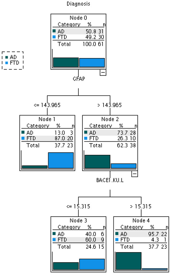 Classification tree obtained for AD (n = 31) vs. FTD (n = 30) patients based on BACE1 activity and GFAP levels in serum. BACE1 activity resulted in being able to discriminate AD from FTD patients with very high percentage (95.7%).