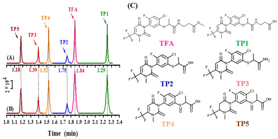 All sample extracts underwent analysis using a UHPLC system (LC-20AD XR, Shimadzu Corporation, Kyoto, Japan) coupled with a SCIEX X500R Q-TOF-MS/MS instrument (AB SCIEX Corporation, Los Angeles, CA, USA) featuring a Turbo VTM source. The Waters Thermo scientific Hypersli Gold C8 column (2.1 × 100 mm, 1.7 µm) separated the compounds. The column was maintained at 40 °C to decrease the sample’s viscosity, while the autosampler was kept at 4 °C. A mixture of water (containing 0.1% v/v formic acid) (A) and acetonitrile (B) was used as the mobile phase at a flow rate of 0.35 mL/min. The gradient procedure was performed in the following steps: 0 min, 30% A; 1 min, 60% A; 1.5 min, 90% A; 2 min, 60% A; 2.5 min, 30% A. The total run time was 2.5 min, and all compounds were successfully separated, as shown in Figure 1. The retention times for TFA, TP1, TP2, TP3, TP4, and TP5 were 1.84, 2.25, 1.75, 1.39, 1.52 and 1.18 min with an injection volume of 4 μL.