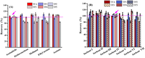 The detection recovery by using different solvents and sorbents. (A) Solvent: acetonitrile, dichloromethane, methanol, ethyl acetate, and acetone); (B) sorbent: I: 50 mg C18 + 150 mg MgSO4, II: 50 mg PSA + 150 mg MgSO4, III: 5 mg GCB + 150 mg MgSO4, IV: 5 mg MWCNT + 150 mg MgSO4, V: 50 mg C18 + 50 mg PSA + 150 mg MgSO4, VI: 50 mg C18 + 5 mg GCB + 150 mg MgSO4, VII: 50 mg C18 + 50 mg PSA + 5 mg GCB + 150 mg MgSO4. Of note, TFA and its TPs in ferralsol matrix were tested at the 100 µg/kg level in acetonitrile (n = 3).