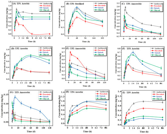 The residue variation of TPs under diverse conditions. (A) TP1 under aerobic conditions, (B) TP1 under sterilized conditions, (C) TP1 under anaerobic conditions, (D) TP2 under aerobic conditions, (E) TP2 under anaerobic conditions, (F) TP3 under aerobic conditions, (G) TP3 under anaerobic conditions, (H) TP4 under aerobic conditions, and (I) TP5 under aerobic conditions.