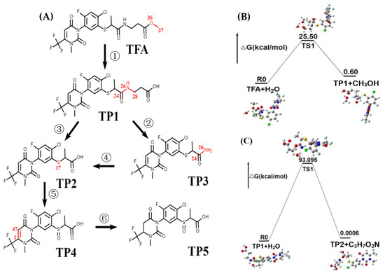 Proposed dissipation pathways of TFA. (A) Six mainly characterized chemical reactions: ① ester cleavage, ② amide hydrolysis, ③ amide cleavage, ④ amide hydrolysis, ⑤ sulfur oxidation, and ⑥ nitrogen heterocyclic reduction. Mechanistic energy diagrams of the reaction, at the B3LYP/6–311G(d) level: (B) TFA + H2O → TP1 + CH3OH, (C) TP1 + H2O → TP2 + C3H7O2N.