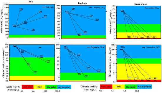 Likewise, the transformants showed no harm to fish and Daphnia, displaying acute toxicity LC50 within the range of 226.186~2016.184 mg/L and 113.899~1451.282 mg/L, respectively. However, the transformants exhibited high toxicity to green algae, with EC50 values ranging from 0.032 mg/L to 0.374 mg/L. In contrast, chronic toxicity assessments revealed certain decomposed products to be more toxic than TFA itself. Specifically, TP2 (3.264 mg/L), TP3 (1.626 mg/L), TP4 (9.655 mg/L), and TP5 (8.690 mg/L) were harmful to fish. Moreover, TP2 (8.458 mg/L) and TP3 (5.496 mg/L) posed risks to daphnia. Additionally, TP1 (0.102 mg/L) exhibited toxicity to green algae, while TP2 (0.087 mg/L), TP3 (0.009 mg/L), TP4 (0.090 mg/L), and TP5 (0.091 mg/L) showed high toxicity levels to green algae.