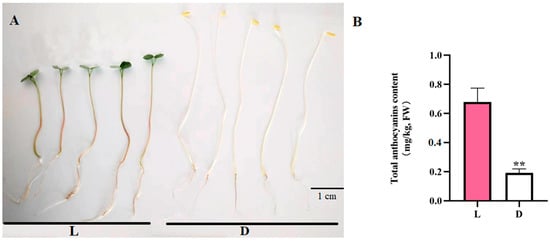 (A) Tartary buckwheat ‘Jiniqiao 2’ sprouts under light (L) and dark (D) treatments, (B) and their total anthocyanin contents (** p < 0.01).