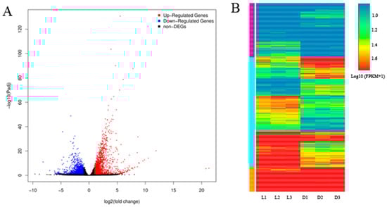 A total of 2774 genes were differently expressed between sprouts under dark and light treatments, with 1666 upregulated genes and 1110 downregulated genes in dark-treatment sprouts (Table S4, Figure 2A). A hierarchical clustering map was obtained based on the gene expression patterns (Figure 2B), and light significantly affected the expression levels of most genes: some genes showed low expression levels and some expressed higher levels in both dark-treatment sprouts and light-treatment sprouts, and abundant genes exhibited higher expression profiles in the sprouts under light treatment (Figure 2B). Meanwhile, 12 DEGs were chosen to perform qRT-PCR to verify the reliability of the RNA-seq data, and high consistency between these data were obtained (Figure S1).