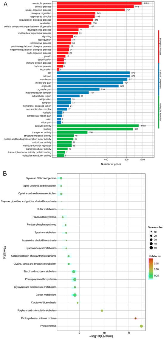 Differentially expressed genes from the D vs. L group were subjected to GO and KEGG analysis to understand the functions of these DEGs and their possible contribution to the coloration process affected by light. Three categories, including the biology process, cellular component, and molecular function, were obtained, and each category contained 10–20 GO terms (Figure 3A). Among them, the biology process contained the largest number of terms (21), and DEGs related to the metabolic process, cellular process, and single-organism process were the most abundant. There were 16 terms contained in the cellular component, and DEGs involved in the cell, cell part, membrane, membrane part, and organelle occupied the majority. The category of molecular function only contained 10 terms, and catalytic activity and binding enriched more abundant DEGs (Figure 3A). In total, 20 significant pathways were identified by KEGG analysis (Figure 3B). Among which, carbon metabolism, phenylpropanoid biosynthesis, and starch and sucrose metabolism enriched the most abundant DEGs, followed by glycolysis/gluconeogenesis and cysteine and methionine metabolism (Figure 3B). Four pathways showed more significant enrichment, including photosynthesis-antenna proteins, porphyrin and chlorophyll metabolism, and carotenoid biosynthesis (Figure 3B), and this indicated that these four pathways were all associated with light.