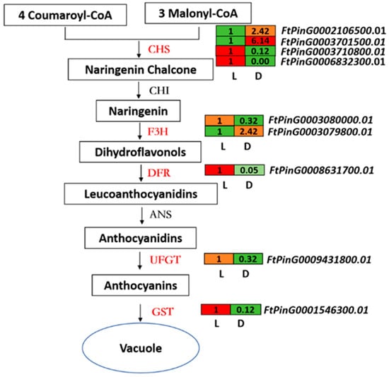 DEGs related to structural genes of anthocyanin biosynthesis and transportation pathways. Enzymes in red and green font indicate that they were up- and down-regulated between L (light treatment) and D (dark treatment) sprouts, respectively, and the digitized heatmap beside the changed enzyme-encoding genes shows their relative expression levels.