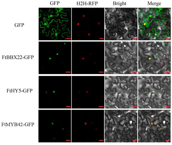 Subcellular localization of FtBBX22, FtHY5, and FtMYB42 in Nicotiana benthamiana leaf epidermal cells. GFP, GFP fluorescence; H2H-RFP, nucleus marker; Merge, merge of GFP, RFP, and bright-field images. Bar = 20 μm.