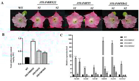 Effects of FtBBX22, FtHY5, and FtMYB42 overexpression in K326 tobacco. (A) Flowers of wild K326 tobacco and transgenic tobacco of overexpression of FtBBX22, FtHY5, and FtMYB42. (B) The total anthocyanin contents in the transgenic tobacco. (C) The expression levels of anthocyanin biosynthesis genes in transgenic lines (significant analyses were performed between each kind of transgenic line (35S: FtBBX22/35S: FtHY5/35S: FtMYB42) and WT plant by TTEST, respectively, * p < 0.05, ** p < 0.01, and *** p < 0.001).