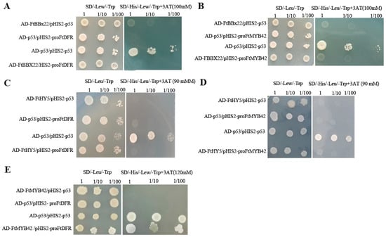 Promoter fragments of FtDFR and FtMYB42 were ligated into the pHIS II vector, and genes (FtBBX22, FtHY5, and FtMYB42) were cloned into the pGADT7 vector. The primers of these genes are listed in Table S1. Five pairs: pHIS II-promoter FtDFR and pGADT7- FtBBX22, pHIS II-promoter FtMYB42 and pGADT7- FtBBX22, pHIS II-promoter FtDFR and pGADT7-FtHY5, pHIS II-promoter FtMYB42 and pGADT7-FtHY5, and pHIS II-promoter FtDFR and pGADT7-FtMYB42, were simultaneously transformed into Y109 yeast strains, respectively, then tested on SD/-Leu/-Trp plates, and further tested on SD/-His/-Leu/-Trp + 3AT plates. Meanwhile, the pair pGADT7-p53 and pHIS II-p53 was used as the positive control, and the pairs pGADT7-p53 and pHIS II-promoter FtDFR/FtMYB42 and pGADT7-FtBBX22/FtHY5/FtMYB42 and pHIS II-p53 were used as negative controls, respectively.