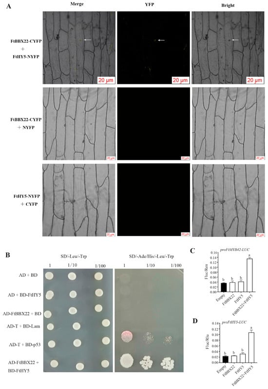 The interaction between FtBBX22, FtHY5, and FtMYB42 as well as anthocyanin biosynthesis gene FtDFR. The physical interaction of FtBBX22 and FtHY5 was tested by BiFC assays (arrows indicate the nucleus) (A) and yeast two-hybrid assays (B). FtBBX22 and FtHY5 jointly promoted the expression of FtMYB42 (C) and FtDFR (D). Lowercase letters above bars indicate a significant difference determined by two-way ANOVA followed by multiple comparisons with Tukey’s test (p < 0.05).