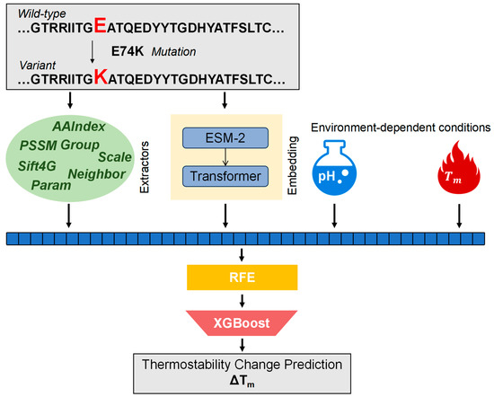 Protein thermostability refers to proteins’ resilience in maintaining their three-dimensional conformations when exposed to elevated temperatures [1]. When subjected to temperatures outside their optimal range, proteins can undergo denaturation, ultimately leading to the loss of their native structural integrity and, consequently, their functional capabilities. Therefore, the enhancement of protein thermostability has become a critical focal point in the fields of biopharmaceuticals, enzyme engineering, and food engineering research [2,3,4]. In this regard, single-point mutation plays a significant role in protein engineering. By altering a single amino acid residue within the protein sequence, the mutation can confer enhanced stability and activity to a protein, allowing it to function effectively at temperatures exceeding its normal physiological range [5,6].