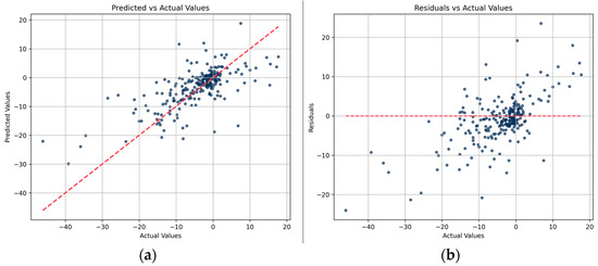 The correlation between PON-Tm prediction values and actual values on the test dataset (a) and between actual values and residuals obtained by subtracting the predicted values from the actual values (b). The red dashed line represents the reference baseline.