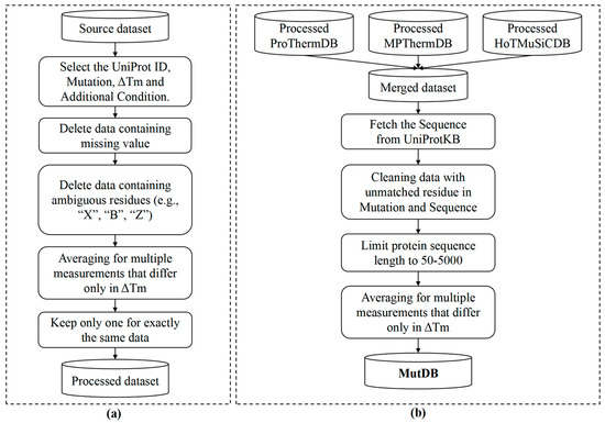 The procedure of MutDB construction. (a) Procedure for each dataset; (b) combination of the data from ProThermDB, HoTMuSiC, and MPTherm.