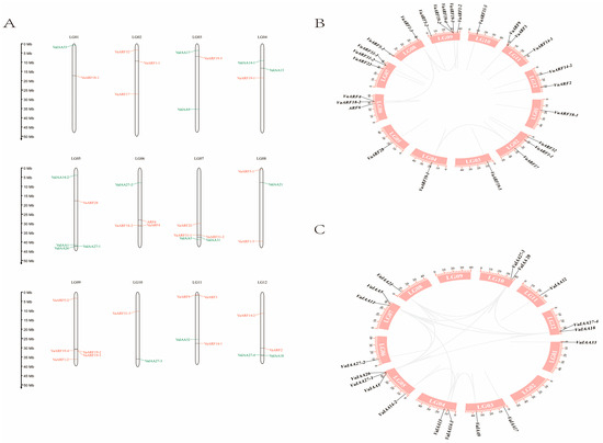 The distribution of VaARF and VaIAA family members on the chromosomes of Vaccinium bracteatum. (A) The chromosome mapping of VaARFs-IAAs and (B) collinearity among VaARF gene families within the chromosome. (C) collinearity among VaIAA gene families within the chromosome.The chromosome number is listed at the top of each vertical bar. The ruler depicts the length of the chromosome/Mb. The red color on the chromosome is the ARF gene, and the green color is the IAA gene. The gray line indicates that most of the ARF and IAA genes have a collinear relationship among species. Chromosomes 1–12 are shown in pink, with ARF and IAA gene names on the periphery.