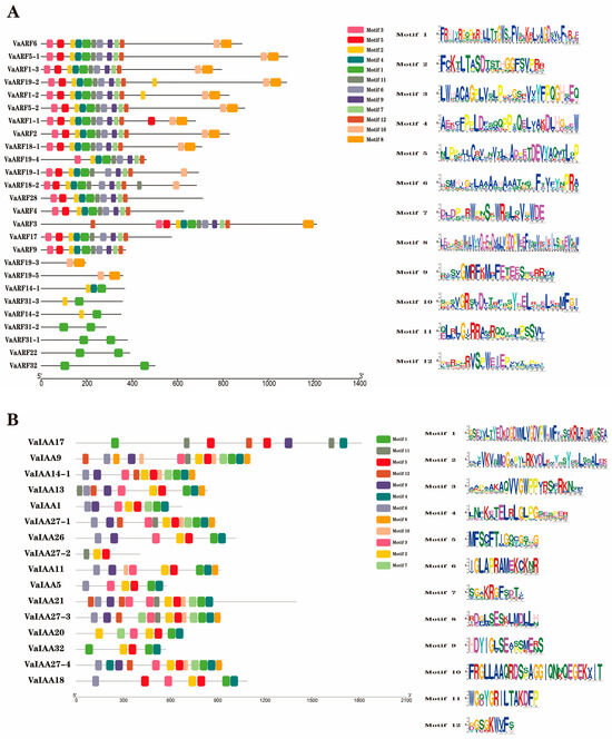 Based on the protein sequences of VaARFs and VaIAAs, these conserved motifs were discovered using the MEME website. The conserved motifs of VaARF and VaIAA proteins were analyzed, and 12 conserved motifs (motifs 1–12) were found in both proteins (Figure 5A,B). Their sequences are shown on the right side of Figure 5. In addition to motifs 8 and 10, the remaining 10 motifs are prevalent in most ARFs. VaARF22, VaARF32, VaARF31-1, and VaARF31-2 contain only motif 1, and these four genes may be functionally redundant. VaARF19-3 and VaARF19-5 contain only motifs 8 and 10. Motif 10 is unique to VaARF6, VaARF5-1, VaARF1-3, VaARF19-2, VaARF1-2, VaARF5-2, VaARF1-1, VaARF2, VaARF19-1, VaARF18-1, and VaARF18-2. For the IAA gene family, all VaIAAs except VaIAA27-1 contain motif 1, indicating that it plays an important and possibly structural role in VaIAAs.