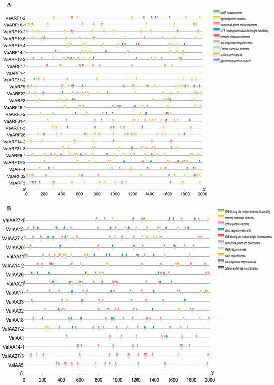 Analysis of cis-regulatory elements in the VaARF and VaIAA families. (A) Analysis of cis-regulatory elements in the VaARFs (B) Analysis of cis-regulatory elements in the VaIAAs. Trans-acting regulatory elements discovered in the promoter regions are represented in different blocks colored according to the type of element.