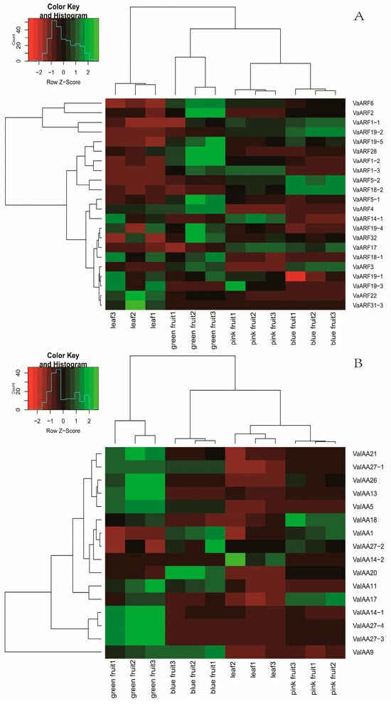 Expression pattern in the VaARF and VaIAA gene families during different stages of fruiting. (A) Expression pattern in the VaARFs (B) Expression pattern in the VaIAAs.