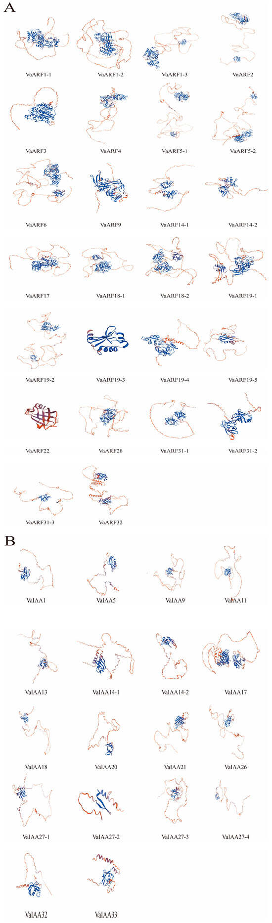 Three-dimensional structure model of VaARF/VaIAA proteins. (A) Three-dimensional structure model of VaARF proteins (B) Three-dimensional structure model of VaIAA proteins. Ramachandran plots were also used to validate the models of the various proteins that were obtained.