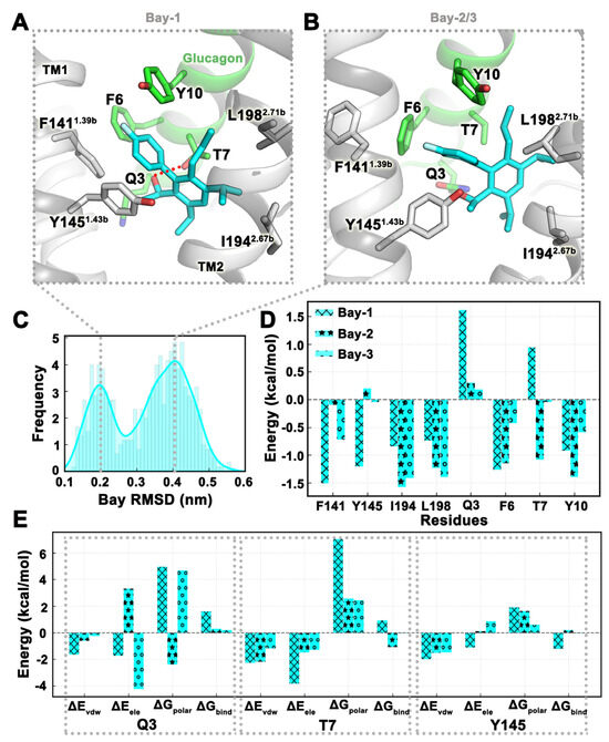 The binding conformation of Bay 27-9955 in Pocket 3 was selected as the initial conformation for MD simulation, and a total of three trajectories were simulated, each of which was run for 180 ns, and the trajectories in the last 20 ns were selected for analysis. From the frequency distribution plot of Bay 27-9955 RMSD values, there were two binding modes for small molecules (Figure 3C). In trajectory Bay-1, the small molecule formed hydrogen bonds with T7 of glucagon, formed π-π stacking with Y1451.43b, and also had hydrophobic interactions with I1942.67b and L1982.71b (Figure 3A). In trajectories Bay-2 and Bay-3, small molecules hardly formed hydrogen bonds and mainly formed hydrophobic interactions (Figure 3B). The binding free energy of the three trajectories in the last 20 ns was −25.59 ± 3.09 kcal/mol. The binding free energies of each trajectory were −19.43 kcal/mol, −29.21 kcal/mol, and −28.12 kcal/mol, respectively. The van der Waals energy and polar solvation energy were similar in the three trajectories, and van der Waals energy marked the main contribution. Differently, in trajectory Bay-1, the electrostatic energy was much higher than the other two trajectories, which was also the reason for its overall high binding free energy (Table 3). Energy decomposition showed that the contribution of residues Q3 and T7 on glucagon in trajectory Bay 1 to the binding free energy was positive, mainly because the polar solvation energies of these two residues were high positive values, which were 4.96 kcal/mol and 7.02 kcal/mol, respectively (Figure 3D,E). The energy contribution of Y1451.43b in the two binding modes was also different. In trajectories Bay-2 and Bay-3, Y1451.43b was adjacent to the hydroxyl group of the small molecule, so the electrostatic energy and polar solvation energy were relatively high, resulting in a positive contribution to the binding free energy (Figure 3D,E).