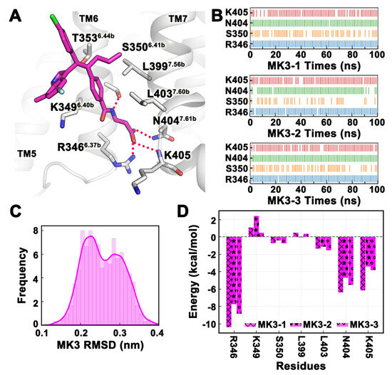 It had been suggested [17] that compounds with chemical similarity to MK-0893 may bind to the same site. Therefore, the binding conformation of MK-3577 in Pocket 2 was used as a template to build the MD simulation system, and a total of three trajectories were simulated, each running for 100 ns, and the trajectories of the last 20 ns were selected for analysis. From the frequency distribution map of MK-3577 RMSD values, although there were two peaks, they were very close to each other (Figure 4C). Analyzing the trajectories, it was found that there was only one binding mode because the RMSD value changed due to the deflection of other groups outside the 3- (4-methylbenzoylamino) propionic acid group (Figure 4A). The hydrogen bonds formed by MK-3577 with residues R3466.37b, N4047.61b, and K405 were stable in all three simulated trajectories, while the frequency of hydrogen bonds formed with residue S3506.41b fluctuated, especially in the MK3-2 trajectory (Figure 4B). The binding free energy of the three trajectories in the last 20 ns was −29.72 ± 1.82 kcal/mol. The binding free energies of each trajectory were −31.97 kcal/mol, −26.12 kcal/mol, and −31.06 kcal/mol, respectively. Except for the electrostatic energy of the MK-2 trajectory (4.23 kcal/mol), which was a large positive value, van der Waals energy and polar solvation energy were similar for all three trajectories (Table 3). The energy decomposition results of the binding free energy were consistent with the hydrogen bonding frequency, with residues R3466.37b, N4047.61b, and K405 contributing greatly to the binding of small molecules, and the non-polar aliphatic amino acid L4037.60b also contributed (Figure 4D).