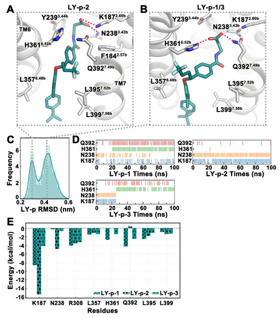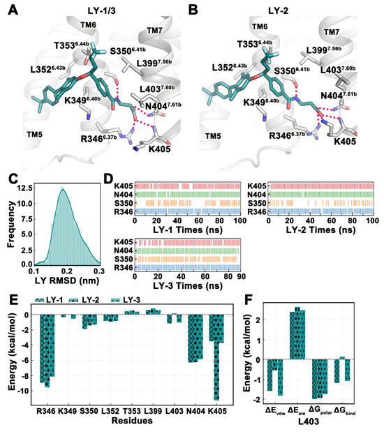 Studies [17] had shown that LY2409021 competed with MK-0893 in concentration-dependent binding. We used the binding conformation of LY2409021 in Pocket 2 as a template to build the MD system and simulated a total of three trajectories, each running for 100 ns, 100 ns, and 90 ns, respectively. The last 20 ns of trajectories were selected for analysis. From the frequency profile of LY2409021 RMSD, there was only one binding mode for the small molecule (Figure 5C). Analysis of the trajectories also showed that although the binding mode of LY2409021 was the same in each trajectory and formed hydrogen bonds with R3466.37b, S3506.41b, N4047.61b, and K405, the side chain of K405 in trajectory LY-2 ‘warped’ and formed hydrogen bonds with the carboxyl group of LY2409021 (Figure 5A,B). The hydrogen bonds formed by LY2409021 with residues R3466.37b, N4047.61b, and K405 were all stable over time, while the frequency of hydrogen bonds formed with S3506.41b fluctuated, especially in LY-1 and LY-2 trajectories (Figure 5D). The binding free energy of the three trajectories in the last 20 ns was −47.85 ± 4.09 kcal/mol. The binding free energies of each trajectory were −43.87 kcal/mol, −56.02 kcal/mol, and −43.66 kcal/mol, respectively. Except for the electrostatic energy of the LY-2 trajectory (−18.92 kcal/mol), which was relatively negative, van der Waals energy and polar solvation energy were similar for all three trajectories (Table 3). From the perspective of energy decomposition, the energy contributions of key residues in the three trajectories were not significantly different. Specifically, the contribution of K405 in trajectory LY-2 was significant, which may be related to the side chains of K405 being close to LY2409021 and forming hydrogen bonds with them (Figure 5E). Moreover, the contribution of L4037.60b to binding free energy in trajectory LY-2 was positive, while its contribution to binding energy in trajectories LY-1 and LY-3 was negative. This was because the side chain of L4037.60b in trajectory LY-2 deviated, and its contribution to van der Waals energy was not as significant as in trajectories LY-1 and LY-3 (Figure 5F).