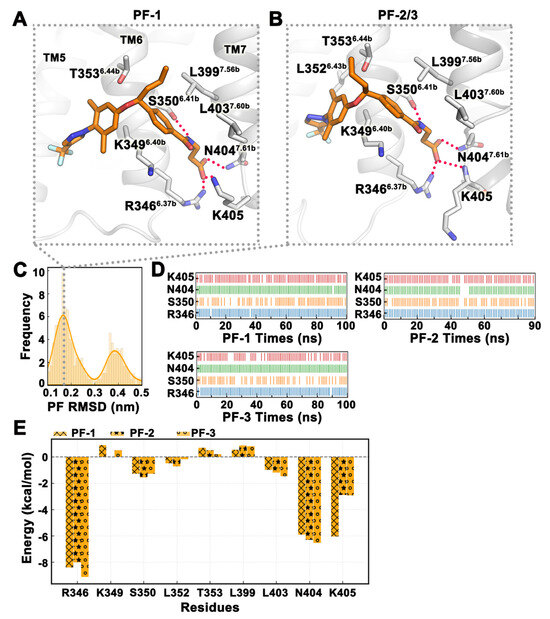 PF-06291874 was chemically similar to MK-0893 and may bind to the same site [17]. Furthermore, the docking results and binding free energy of PF-06291874 in Pocket 2 were the best among the six pockets, and we used this conformation as the initial conformation for MD simulation. We submitted a total of three trajectories, running 100 ns, 90 ns, and 100 ns, and analyzed the final 20 ns of the trajectories. From the frequency distribution map of PF-06291874 RMSD, there was mainly one binding mode for the small molecule (Figure 7C). Analysis of the trajectory revealed that the peak of the RMSD curve at around 0.4 nm was caused by the deviation of the pyrazole group from TM6, but the polarity interaction of small molecules remained unchanged. Although MD simulation mainly obtained one binding mode of PF-06291874, there were two ways to form hydrogen bonds. The side chain of K405 in trajectory PF-1 ‘curled up’ to form hydrogen bonds with the carboxyl groups of small molecules, while the main chain of K405 in trajectories PF-2 and PF-3 formed hydrogen bonds with small molecules, with the side chain extended ‘straight’ towards the direction of the POPC membrane (Figure 7A,B). In the three trajectories, PF-06291874 had stable hydrogen bonds with R3466.37b, N4047.61b, and K405 and a less stable hydrogen bond with S3506.41b (Figure 7D). The binding free energy of the three trajectories in the last 20 ns was −31.76 ± 3.48 kcal/mol. The binding free energies of each trajectory were −33.10 kcal/mol, −37.01 kcal/mol, and −25.17 kcal/mol, respectively. The polar solvation energies of the three trajectories were similar, except that the electrostatic energy of trajectory PF-1 (6.86 kcal/mol) was a large positive value and the van der Waals energy of trajectory PF-3 (−24.52 kcal/mol) was not low enough (Table 3). The difference of hydrogen bond formation between K405 and PF-06291874 in the three trajectories can be clearly observed by energy decomposition (Figure 7E).