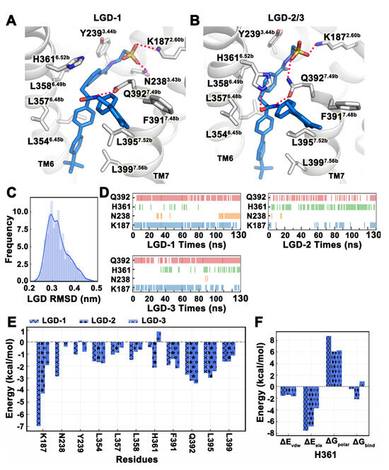 The docking results and binding free energies of LGD-6972 in Pocket 5 were the best among the six pockets, and we used this conformation as the initial conformation for MD simulations. We submitted three trajectories, each simulated for 130 ns, and the last 20 ns were selected for analysis. From the frequency profile of LGD-6972 RMSD, there was only one binding mode for the small molecule (Figure 8C). In trajectory LGD-1, LGD-6972 formed a stable hydrogen bond with K1872.60b and Q3927.49b and maintained a hydrogen bond with N2383.43b from 100 ns to 130 ns (Figure 8A–D). In trajectory LGD-2, LGD-6972 formed stable hydrogen bonds with H3616.52b and Q3927.49b. In trajectory LGD-3, LGD-6972 had a stable hydrogen bond with Q3927.49b, while the hydrogen bond with K1872.60b was gradually unstable after 80 ns, and LGD-6972 had an occasional hydrogen bond with H3616.52b from about 40 ns (Figure 8B–D). The binding free energy of the three trajectories in the last 20 ns was −51.37 ± 7.80 kcal/mol. The binding free energies of each trajectory were −63.51 kcal/mol, −53.78 kcal/mol, and −36.81 kcal/mol, respectively. The van der Waals energies and polar solvation energies of three trajectories were similar, except for the electrostatic energies of LGD-2 and LGD-3 (20.29 kcal/mol and 38.32 kcal/mol, respectively), which were relatively large positive values (Table 3). Energy decomposition showed that K1872.60b and N2383.43b in trajectory LGD-1 contribute more to the binding free energy than in trajectory LGD-2 and LGD-3 (Figure 8E). Surprisingly, in the last 20 ns of trajectory LGD-3, LGD-6972 formed hydrogen bonds with H3616.52b at a higher frequency, but its binding free energy was positive. Decomposing the binding free energy of H3616.52b into each energy term, it was found that the high electrostatic energy of H3616.52b was the cause (Figure 8F). In the following, we used LGD-6972 as an example for structural modifications to increase the feasibility of improving the activity or stability of small molecules based on MD simulation.
