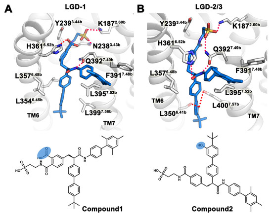 Modified binding modes and 2D structures based on the binding modes of LGD-1 (A) and LGD-2/3 (B). The modified groups are indicated by blue ellipses.
