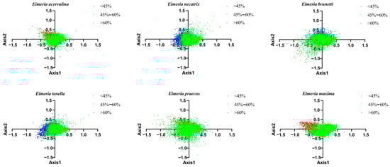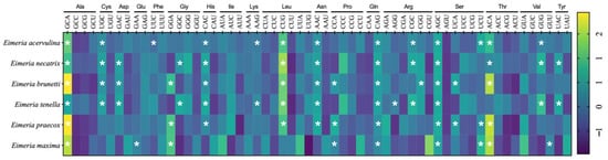 2.8. Comparative Analysis of Codon Usage between Eimeria and Other Organisms