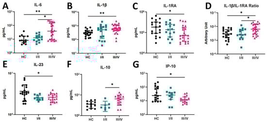 | IL-1β (pg/mL)/IL-1RA (pg/mL) Ratio | 0.233 | −0.295 * | 0.307 * | 0.290 * |