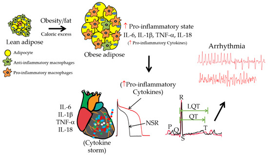 Cartoon illustration shows the hypothesized pro-inflammatory cytokine-linked channelopathies leading to pathological APD prolongation and ventricular arrhythmias. Obesity or excessive eating is associated with enlarged adipose tissue, leading to increased levels of a heightened pro-inflammatory response defined by a cytokine storm of overactivation of pro-inflammatory cytokines (IL-6, IL-1β, TNF-α, and IL-18), all of which are likely to play crucial roles in adverse remodeling of the relative functional expression of major ventricular repolarizing (IKr and IKs) and depolarizing (ICa and INa) macroscopic currents leading to delayed repolarization, which increases the risk for fatal malignant ventricular arrhythmias with obesity. Furthermore, macrophages and adipocytes infiltrate the heart at the onset of metabolic and inflammatory disorders and contribute to cardiac dysfunction, possibly through pathological local levels of individual and multiple combinations of pro-inflammatory cytokines.