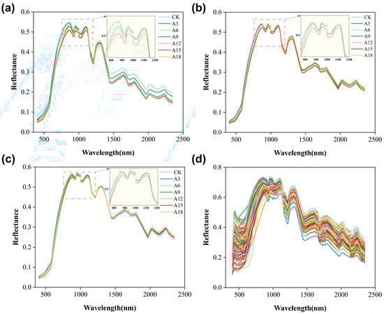 Average preprocessed spectra of all peanut samples. Note: (a–c) Spectral information of the three peanut varieties treated with aging, with line colors representing different aging durations. The spectral partial enlargement view focuses on the 760–1200 nm wavelength region. (d) Spectral information for untreated peanut varieties, with line colors denoting different peanut varieties.