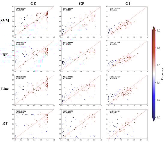 Vigor prediction models were constructed using 485 sets of vigor indexes and corresponding spectral data as input variables to assess the vigor levels of multiple seed varieties. Given the significant differences in the measured data during the analysis, four classical ML algorithms (SVM, RF, Line, and RT) were employed to build the models (Figure 2 and Table S1). For GE, the R2 values were 0.57 for SVM, 0.52 for RF, 0.55 for Line, and 0.097 for RT. For GP, the R2 values were 0.62 for SVM, 0.54 for RF, 0.53 for Line, and 0.24 for RT. For GI, the R2 values were 0.67 for SVM, 0.57 for RF, 0.51 for Line, and 0.19 for RT.