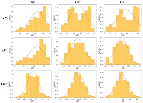 The predicted phenotypic values from ZC seeds are summarized and subsequently organized in Table 3. The predicted values of each indicator from the SVM, RF, and Line models were similar on average, suggesting consistent and overall vigor performance across the models. However, the coefficient of variation analysis revealed variability in the distribution of the predictive data for each model. The SVM and RF models showed more variability than Line. Additionally, the distribution of GE, GP, and GI was approximately normal (Figure 3). The SD analysis across the indexes revealed differences in vigor performance among the varying varieties, potentially providing more genetically diverse phenotypic materials for subsequent GWAS to better investigate differences at the genetic level.