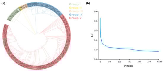 Population structure and linkage disequilibrium analysis. (a) Population structure grouping. (b) LD attenuation trend in the tested peanut varieties.