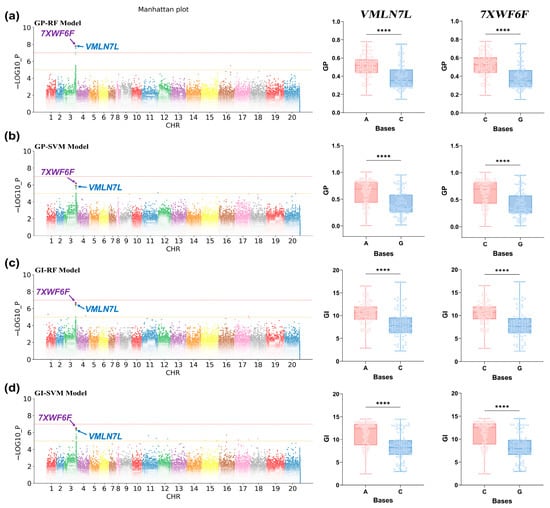 GWAS and haplotype analysis results for phenotypic predictive values. Note: (a–d) GWAS Manhattan plots (left) and haplotype analysis graphs (VMLN7L and 7XWF6F) for phenotypic data predicted by GP-RF, GP-SVM, GI-RF, and GI-SVM, respectively. The horizontal axis is the chromosome number, and the vertical axis is −LOG10_P, which represents the p value calculated for each SNP as −log10. Different colors in the Manhattan plots represent SNPs from different chromosomes. Different colors in the haplotype analysis represent different haplotypes. Genes identified by different significant loci are indicated using color arrows. ****: significant correlation with p < 0.0001.
