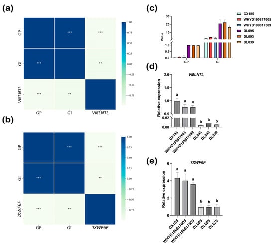 Relative expression of the Arahy.VMLN7L and Arahy.7XWF6F in seeds of different varieties and their correlation analysis with phenotypic traits. (a,b) Correlation analysis of Arahy.VMLN7L and Arahy.7XWF6F with the phenotype. (c) Actual vigor performance of high- and low-vigor germplasms. (d) Relative expression of Arahy.VMLN7L in varieties with different vigor levels. (e) Relative expression of Arahy.7XWF6F in varieties with different vigor levels. Different letters indicate significant differences based on one-way ANOVA of multiple tests (p < 0.05). **, ***: significant correlation with p < 0.01, p < 0.001.