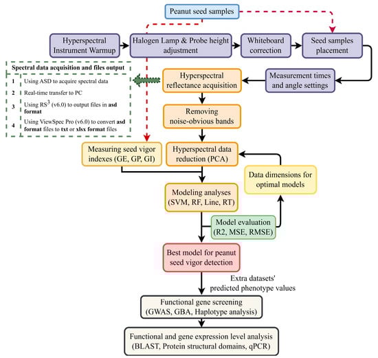Therefore, this study aims to investigate an efficient phenotypic monitoring approach using hyperspectral data containing rich target information to rapidly and non-destructively monitor changes in seed vigor. This could facilitate exploring functional genes potentially associated with phenotypic changes. The study seeks to (a) construct a predictive model using ML regression algorithms to identify the predictive phenotypes for peanut seed vigor, and (b) integrate GWAS with hyperspectral data to identify genes potentially related to the peanut seed vigor phenotype. This study is believed to be substantially implicated in rapidly assessing seed vigor, exploring candidate gene loci, and facilitating the breeding of high-vigor peanut seeds in the future.