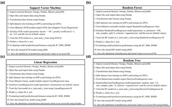 The best model was selected based on evaluation metrics, including r-squared (R2), mean squared error (MSE), and root mean square error (RMSE) from SVM, RF, Line, and RT. Regression models with higher R2 values and lower MSE and RMSE demonstrated superior performance and accuracy.